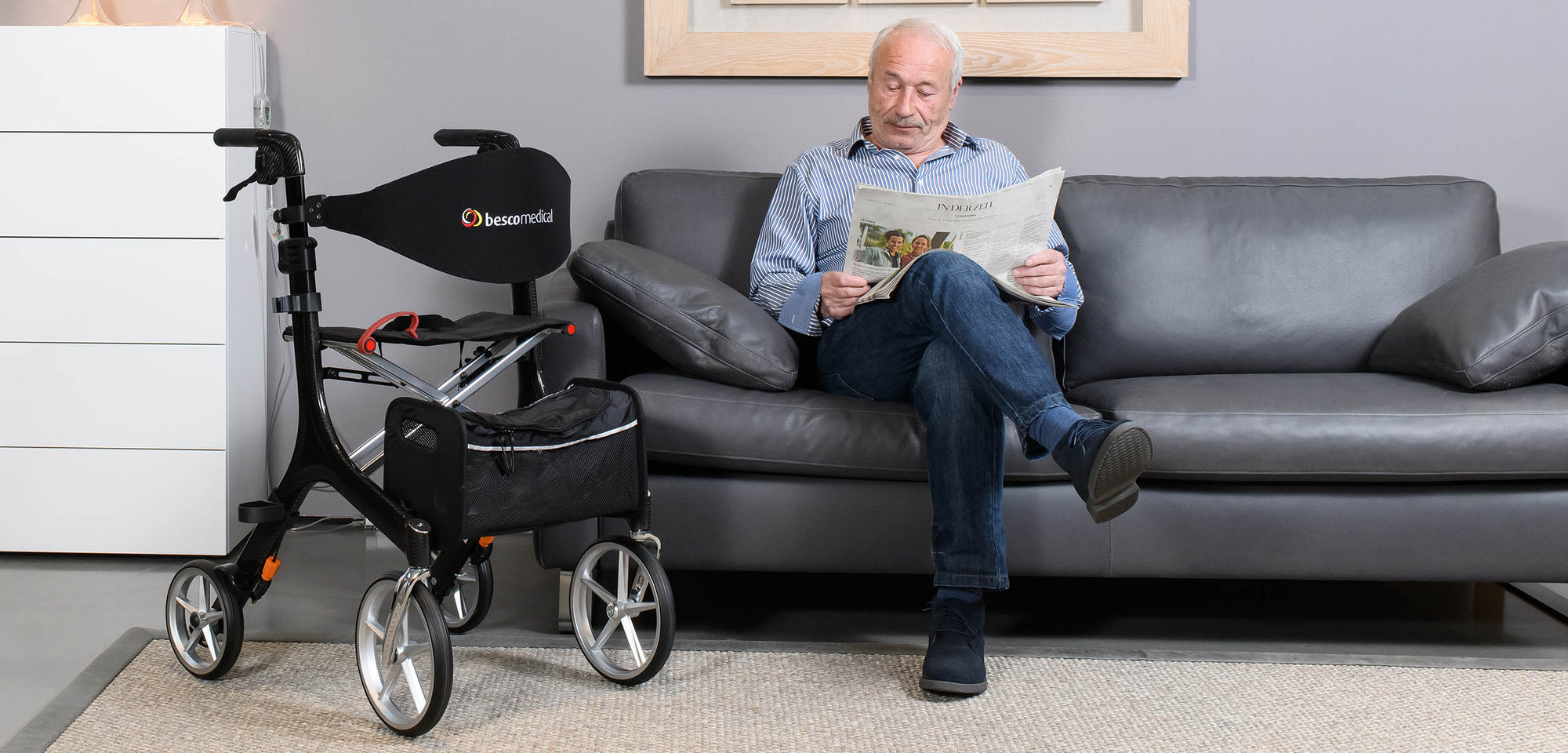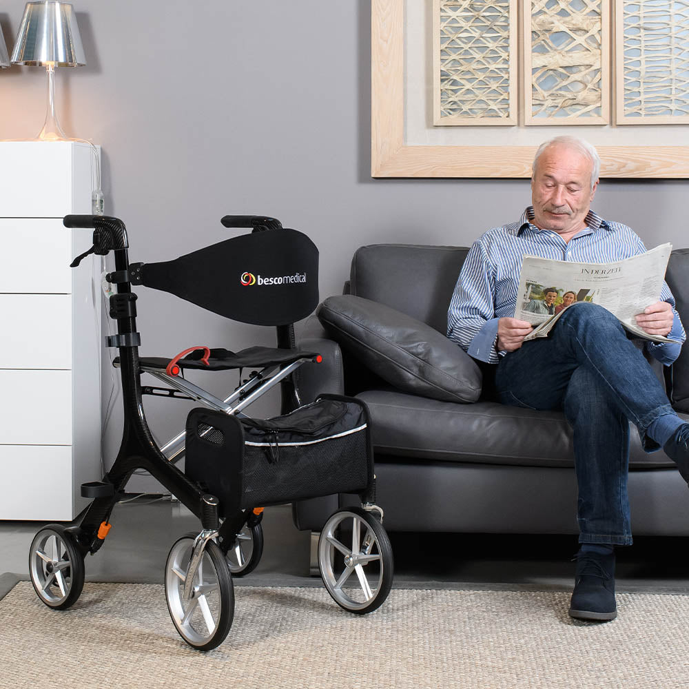 Le déambulateur CARBON de Besco Medical vous accompagne lors de vos sorties quotidiennes et de vos virées shopping, mais il convient également à une utilisation quotidienne en intérieur. Sa conception légère et sa haute maniabilité le rendent parfait sur toute la ligne.